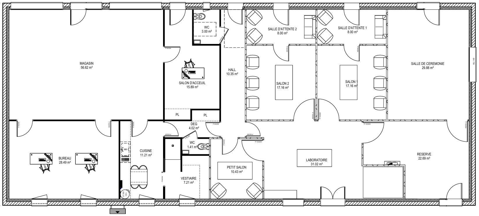 des espaces logistiques : cuisine, bureau, vestiaire, sanitaires.